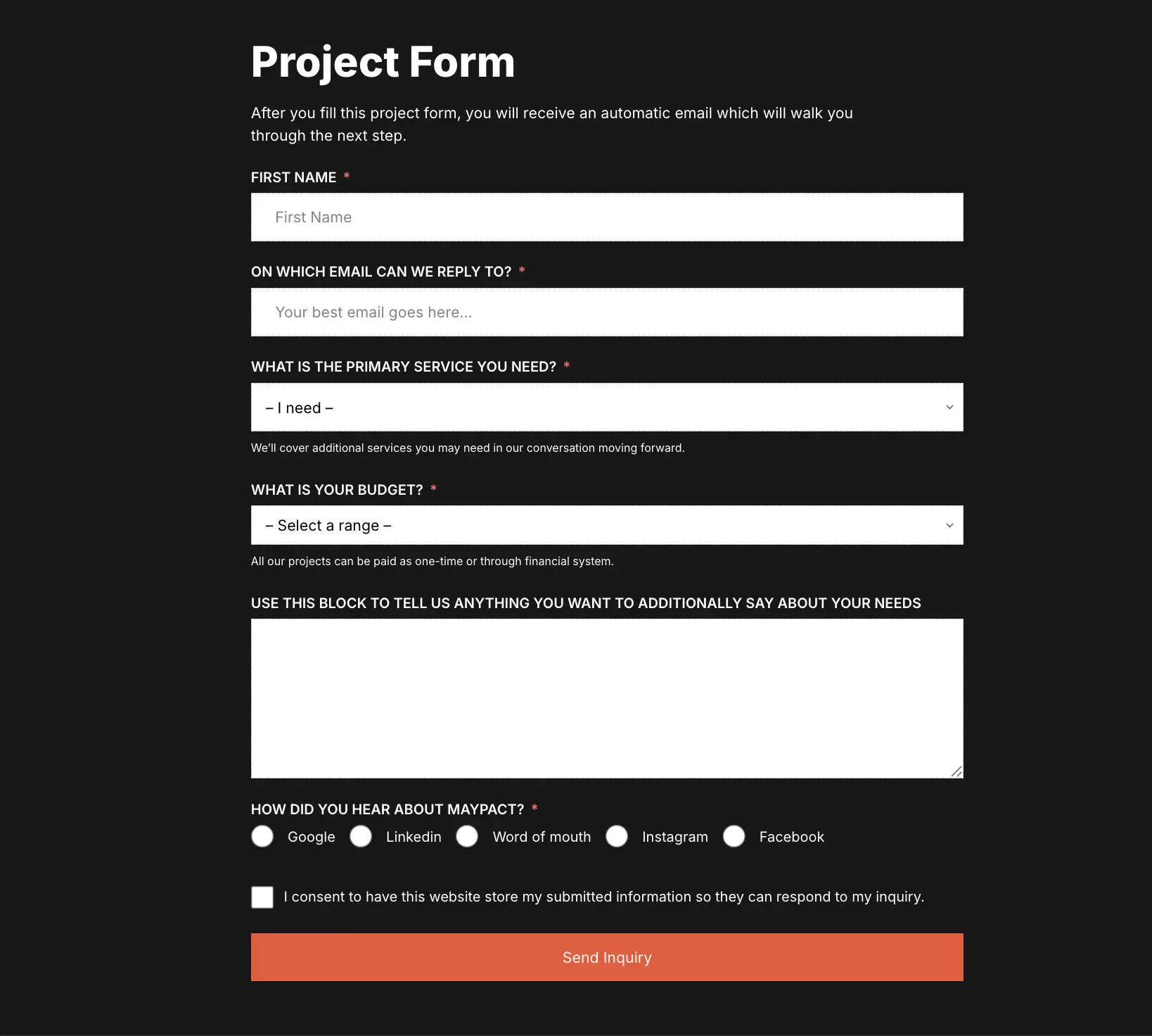 For this example I will note my own project form as well one other form on my website which I use for a specific service I offer.